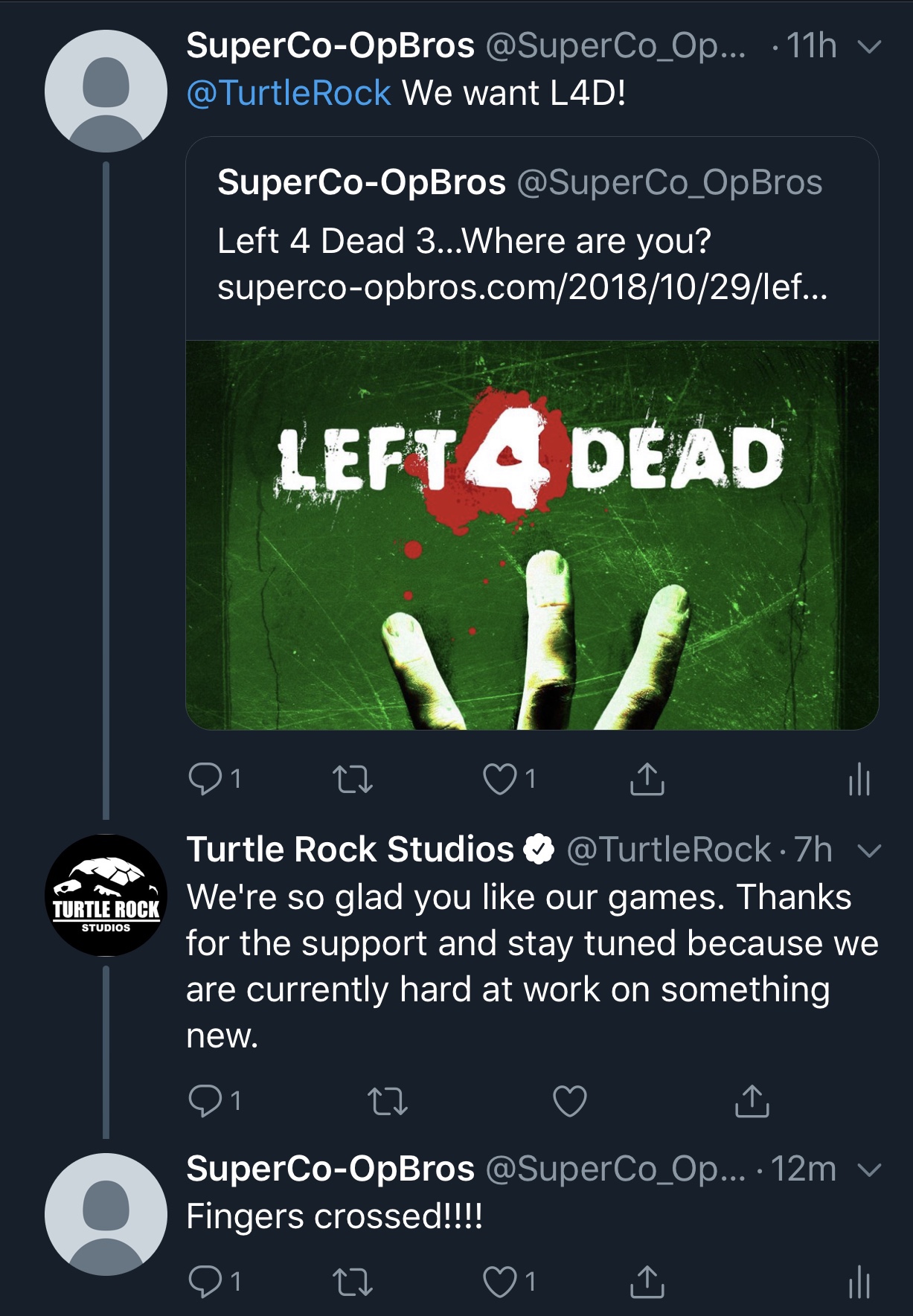This may be wishful thinking but I’ll take it to the bank anyway. In response to our earlier Left 4 Dead 3…Where are you?, Turtle Rock Studios responded to @SuperCo_OpBros with “…stay tuned because we are currently hard at work on something new.” This could be nothing but this sure seems to be a sign of life.