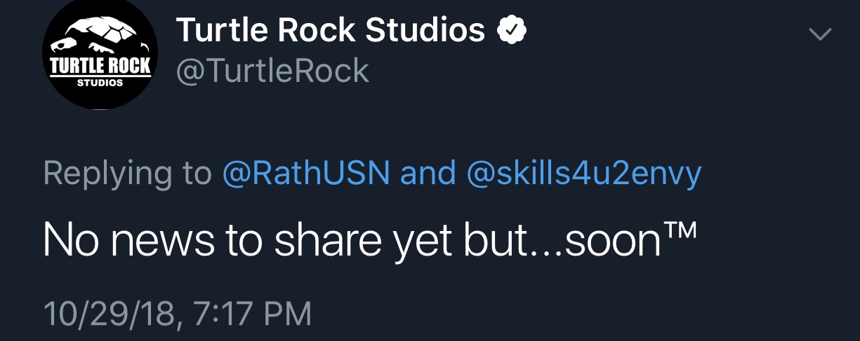 But wait, there is more…uncertainty. Also on Twitter today user @RathUSN asked @TurtleRock if their working on Evolve 2 or Left 4 Dead 3…