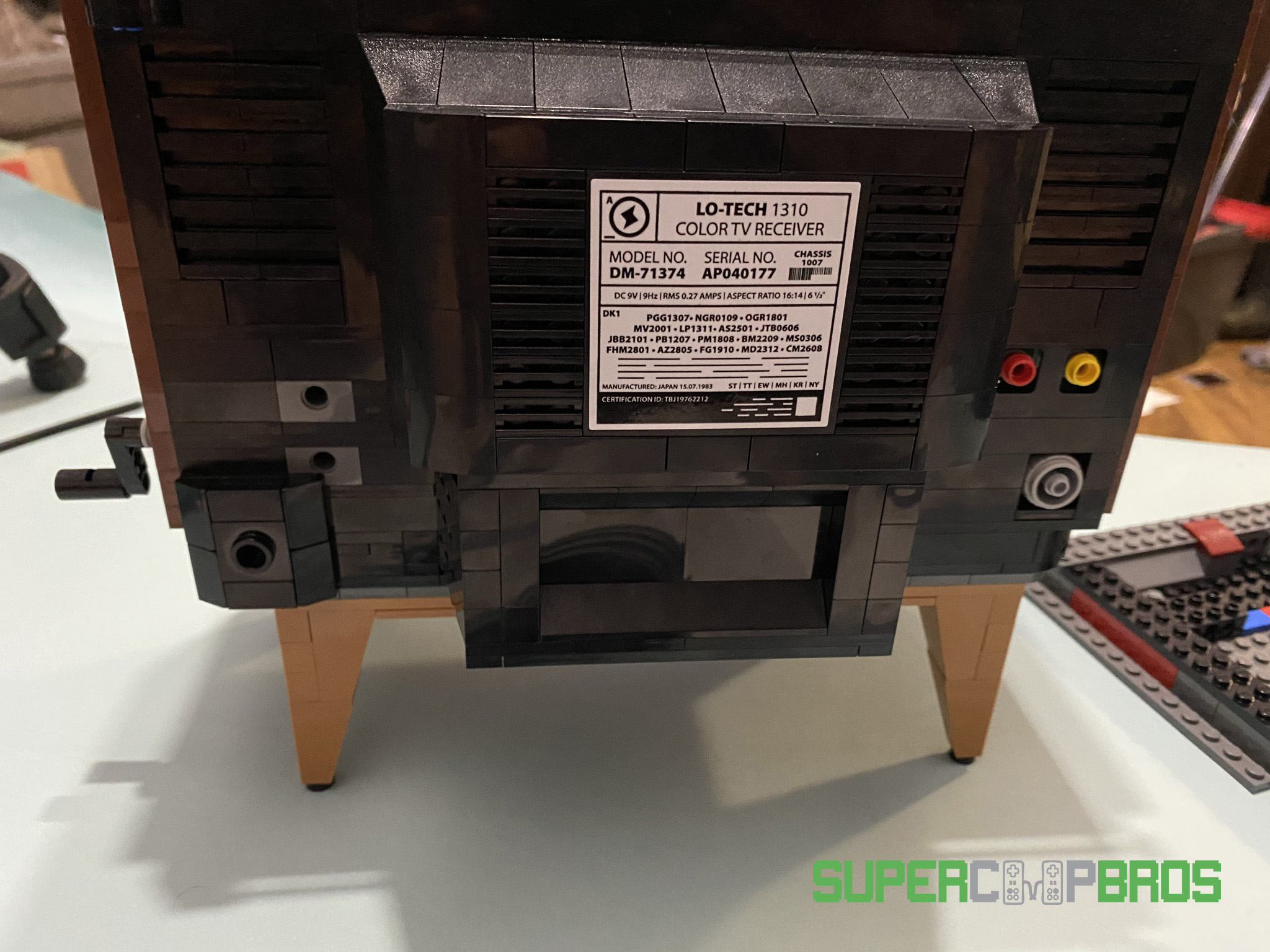 The television itself is also well detailed with a channel dial that clicks, a moveable antenna that clips into the back of the TV, and front trim that screams ’80s TV. The front of the TV is labeled to show what each of the knobs represents LEGO did not stop there and added even more detail to the rear of the TV. The rear not only has a detailed faux product label, but it also comes equipped with AV & coax inputs as well as the power input.Â