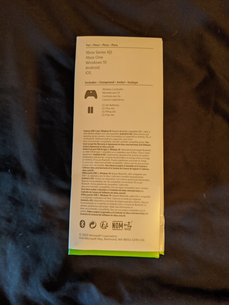 The side of the box shows that the controller is compatible with the Xbox Series X, Xbox One, Windows 10, iOS and Android devices. For the first time, it also confirms the existence of an Xbox Series S model, which is presumably a digital-only version of the Xbox Series X.